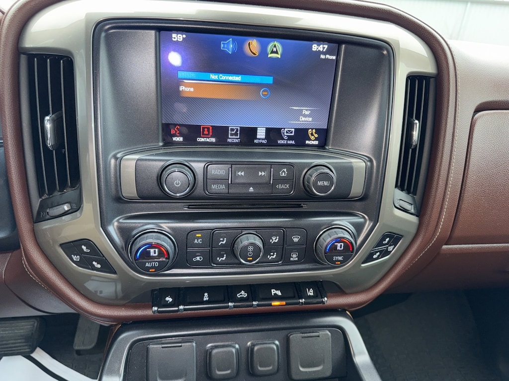 6-Speed Automatic Electronic with Overdrive, 4WD, Saddle Leather, 110-Volt AC Power Outlet, 150 Amp Alternator, 3.42 Rear Axle Ratio, 4 Movable Upper Cargo Tie Downs, 4-Wheel Disc Brakes, 4.2 Diagonal Color Display Driver Info Center, 6 Rectangular Chromed Tubular Assist Steps, 7 Speakers, ABS brakes, Air Conditioning, Alloy wheels, AM/FM radio: SiriusXM, Auto-dimming door mirrors, Auto-Dimming Inside Rear-View Mirror, Auto-dimming Rear-View mirror, Automatic temperature control, Auxiliary External Transmission Oil Cooler, Bluetooth® For Phone, Body Color Rear Bumper w/Cornersteps, Bodyside moldings, Bose Speaker System, Brake assist, Bumpers: body-color, CD player, Chrome Bodyside Moldings, Chrome Cap Power-Adjustable Heated Outside Mirrors, Chrome Door Handles, Chrome Grille Surround, Chrome Mirror Caps, Chrome wheels, Color-Keyed Carpeted Floor Mats, Color-Keyed Carpeting w/Rubberized Vinyl Floor Mats, Compass, Deep-Tinted Glass, Delay-off headlights, Driver & Front Passenger Illuminated Vanity Mirrors, Driver Alert Package, Driver door bin, Driver vanity mirror, Dual front impact airbags, Dual front side impact airbags, Dual-Zone Automatic Climate Control, Electric Rear-Window Defogger, Electronic Stability Control, Emergency communication system: OnStar Directions & Connections, Exterior Parking Camera Rear, EZ Lift & Lower Tailgate, Floor Mounted Console, Front anti-roll bar, Front Body-Color Bumper, Front Bucket Seats, Front Center Armrest w/Storage, Front dual zone A/C, Front fog lights, Front Frame-Mounted Black Recovery Hooks, Front Full Feature Power Reclining Bucket Seats, Front Halogen Fog Lamps, Front License Plate Kit, Front reading lights, Front wheel independent suspension, Fully automatic headlights, Garage door transmitter, Heated & Cooled Driver & Front Passenger Seats, Heated door mirrors, Heated front seats, Heavy Duty Suspension, Heavy-Duty Rear Locking Differential, High Country Premium Package, Illuminated entry, Integrated Trailer Brake Controller, Interior Driver Assist Handle (LPO), Leather Wrapped Heated Steering Wheel, Leather Wrapped Steering Wheel w/Cruise Controls, LED Cargo Box Lighting, Low tire pressure warning, Manual Tilt/Telescoping Steering Column, Memory seat, Occupant sensing airbag, OnStar 6 Months Directions & Connections Plan, Outside temperature display, Overhead airbag, Overhead console, Panic alarm, Passenger door bin, Passenger vanity mirror, Perforated Leather Appointed Seat Trim, Polished Exhaust Tip, Power Adjustable Pedals, Power door mirrors, Power driver seat, Power passenger seat, Power Sliding Rear Window, Power steering, Power Sunroof, Power windows, Power Windows w/Driver Express Up, Preferred Equipment Group 3LZ, Premium audio system: Chevrolet MyLink, Radio data system, Radio: AM/FM 8 Diagonal Color Touch Screen, Radio: AM/FM Stereo w/8 Diagonal Color Touch Nav., Rear 60/40 Folding Bench Seat (Folds Up), Rear reading lights, Rear seat center armrest, Rear step bumper, Rear Vision Camera w/Dynamic Guide Lines, Rear Wheelhouse Liners, Rear window defroster, Remote Keyless Entry, Remote keyless entry, Remote Vehicle Starter System, Security system, Single Slot CD/MP3 Player, SiriusXM Satellite & HD Radio, Speed control, Speed-sensing steering, Split folding rear seat, Steering Wheel Audio Controls, Steering wheel mounted audio controls, Tachometer, Telescoping steering wheel, Theft Deterrent System (Unauthorized Entry), Tilt steering wheel, Traction control, Trailering Equipment, Trip computer, Turn signal indicator mirrors, Ultrasonic Front & Rear Park Assist, Universal Home Remote, Variably intermittent wipers, Ventilated front seats, Vinyl Tonneau Cover w/Integrated Support Bows (LPO), Voltmeter, Wheels: 20 x