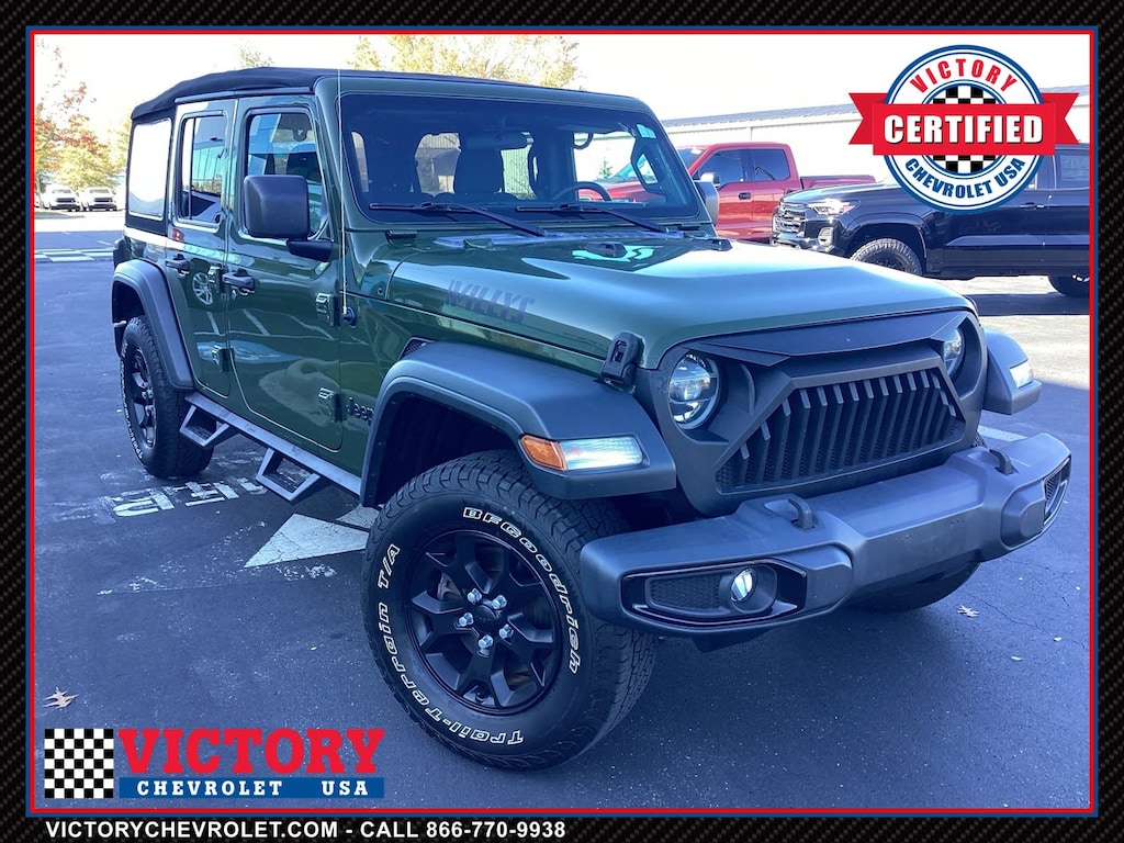 Clean CARFAX.Victory Chevrolet Certified.4-Wheel Drive Swing Gate Decal, Anti-Lock 4-Wheel Disc HD Brakes, Anti-Spin Differential Rear Axle, Automatic Headlamps, Black Grille, Black Trail Rated Badge, Cold Weather Group, Convenience Group, Deep Tint Sunscreen Windows, Front 1-Touch Down Power Windows, Front LED Fog Lamps, Heated Front Seats, Heated Steering Wheel, Leather Wrapped Steering Wheel, LED Headlamp & Fog Lamp Group, LED Reflector Headlamps, Matte Black Jeep Badge, MOPAR All-Weather Floor Mats, Power Heated Mirrors, Quick Order Package 22W Willys, Remote Keyless Entry, Security Alarm, Speed Sensitive Power Locks, Sun Visors w/Illuminated Vanity Mirrors, Universal Garage Door Opener, Wheels: 17 x 7.5 Moab Black Aluminum, Willys, Willys Hood Decal, Wrangler Decal, 1-Year SiriusXM Radio Service, 3.45 Rear Axle Ratio, 4-Wheel Disc Brakes, 7.0 Touchscreen Display, 8 Speakers, ABS brakes, Air Conditioning, Air Conditioning w/Auto Temperature Control, Air Filtering, AM/FM radio, Apple CarPlay (DISC), Aux Battery, Brake assist, Bridgestone Brand Tires, Cloth Low-Back Bucket Seats, Cluster 7.0 TFT Color Display, Compass, Delay-off headlights, Driver door bin, Driver vanity mirror, Dual front impact airbags, Dual front side impact airbags, Electronic Stability Control, Front anti-roll bar, Front Bucket Seats, Front Center Armrest w/Storage, Front fog lights, Front reading lights, Google Android Auto (DISC), GPS Antenna Input, Integrated Center Stack Radio, Integrated roll-over protection, Integrated Voice Command w/Bluetooth, Low tire pressure warning, MOPAR All-Weather Floor Mats (DISC), Non-Lock Fuel Cap w/o Discriminator, Normal Duty Suspension, Occupant sensing airbag, Outside temperature display, ParkView Rear Back-Up Camera, Passenger door bin, Passenger vanity mirror, Power steering, Premium Black Sunrider Soft Top, Radio data system, Radio: Uconnect 3 w/5 Display, Radio: Uconnect 4 w/7 Display, Rear anti-roll bar, Rear reading lights, SiriusXM Satellite Radio, Speed control, Split folding rear seat, Steering wheel mounted audio controls, Stop-Start Dual Battery System, Tachometer, Technology Group, Telescoping steering wheel, Tilt steering wheel, Traction control, Trip computer, USB Host Flip, Variably intermittent wipers, Wheels: 17 x 7.5 Black Steel Styled, 4-Wheel Drive Swing Gate Decal, Anti-Lock 4-Wheel Disc HD Brakes, Anti-Spin Differential Rear Axle, Automatic Headlamps, Black Grille, Black Trail Rated Badge, Cold Weather Group, Convenience Group, Deep Tint Sunscreen Windows, Front 1-Touch Down Power Windows, Front LED Fog Lamps, Heated Front Seats, Heated Steering Wheel, Leather Wrapped Steering Wheel, LED Headlamp & Fog Lamp Group, LED Reflector Headlamps, Matte Black Jeep Badge, MOPAR All-Weather Floor Mats, Power Heated Mirrors, Quick Order Package 22W Willys, Remote Keyless Entry, Security Alarm, Speed Sensitive Power Locks, Sun Visors w/Illuminated Vanity Mirrors, Universal Garage Door Opener, Wheels: 17 x 7.5 Moab Black Aluminum, Willys, Willys Hood Decal, Wrangler Decal.Exit 12 or 14 on 485. Call Now (866) 900-6224.
